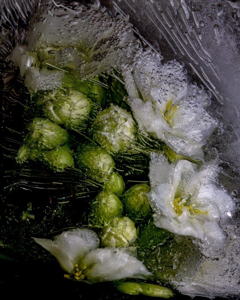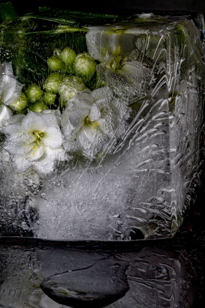 In dem Fotoprojekt wurden mehrere kleine, weiße bis hellgelbe Blüten und Knospen, eingeschlossen in einem einzelnen, nahezu perfekten, großen Eiswürfel vor einem tiefdunklen, fast schwarzen Hintergrund abgelichtet.